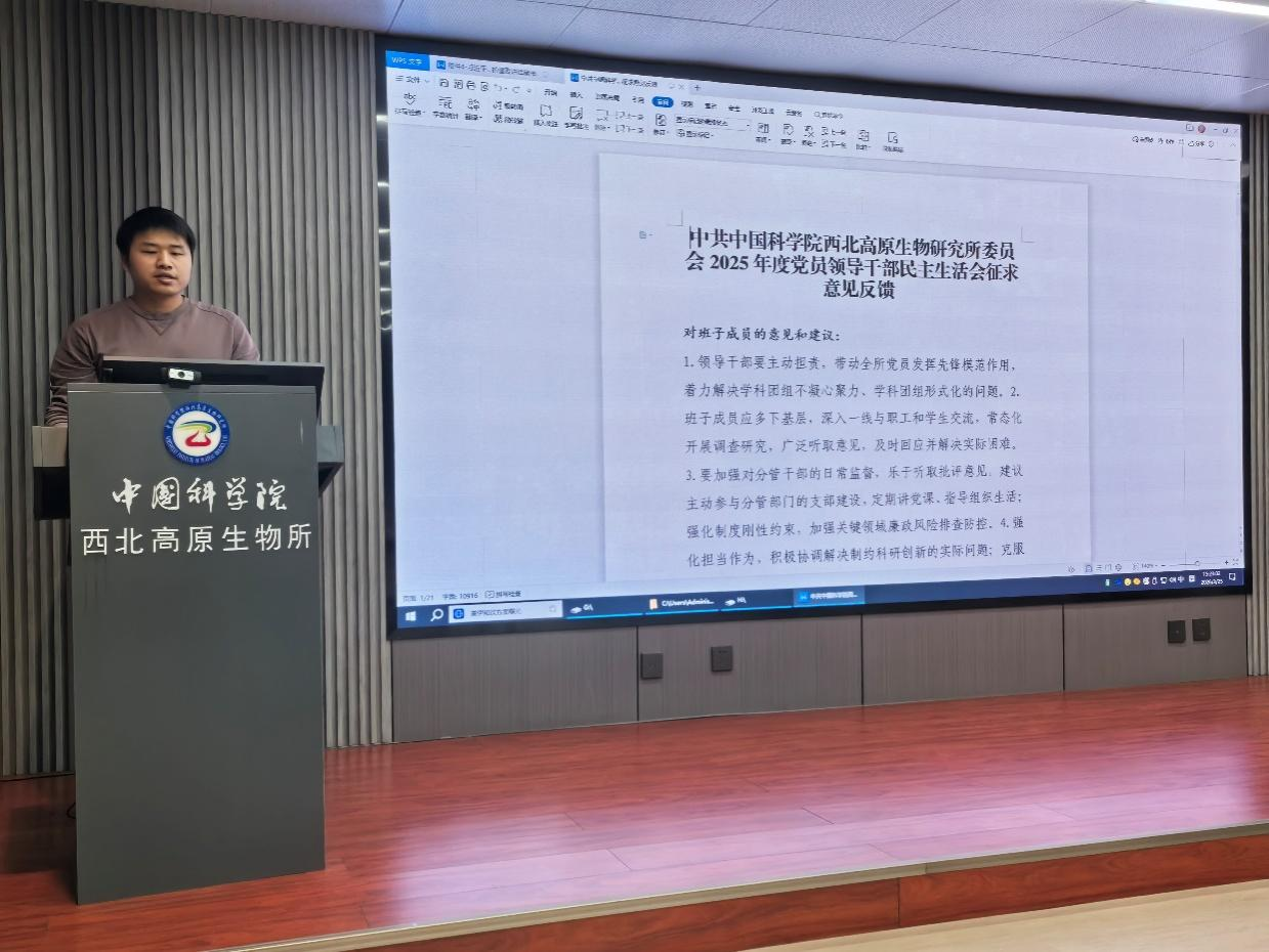 组织委员兼纪检委员张昆领学了习近平在中共中央政治局第二十四次集体学习会议精神,通报了《中共中国科学院西北高原生物研究所委员会2025年度党员领导干部民主生活会征求意见反馈》。