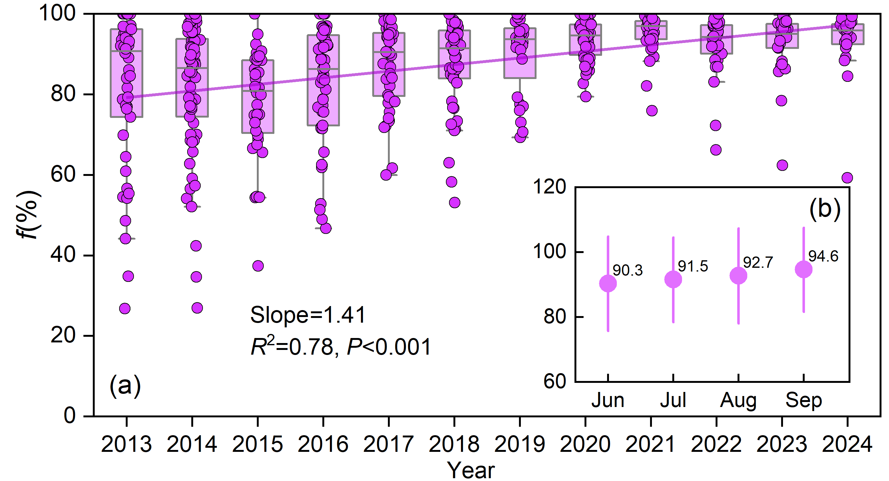 2013至2024年研究区剩余雨滴组分的时间变化趋势(a) 年际变化(b) 月度变化