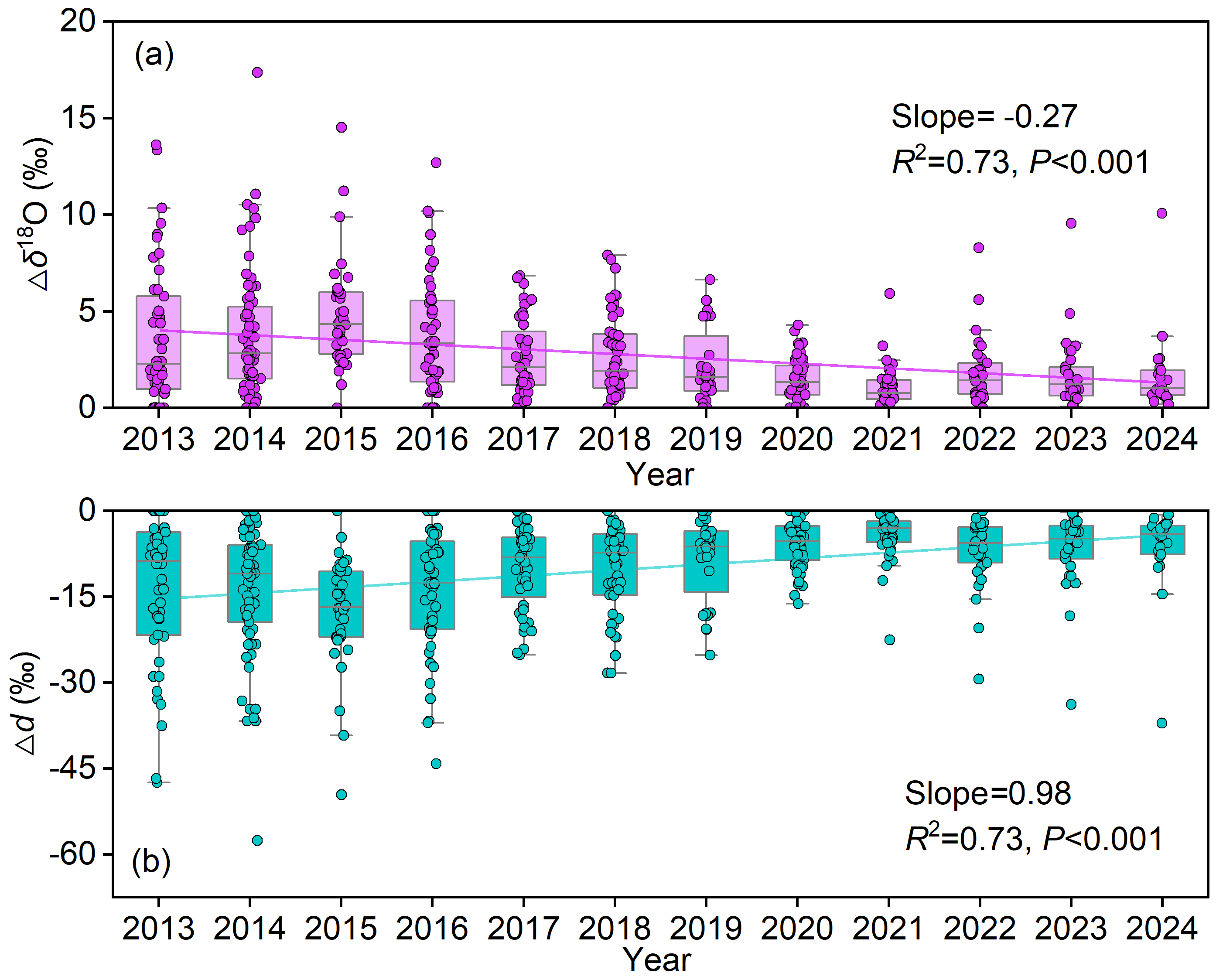 2013至2024年降水从云底到地面的δ¹⁸O和d-excess变化量(Δδ¹⁸O和Δd)的年际趋势