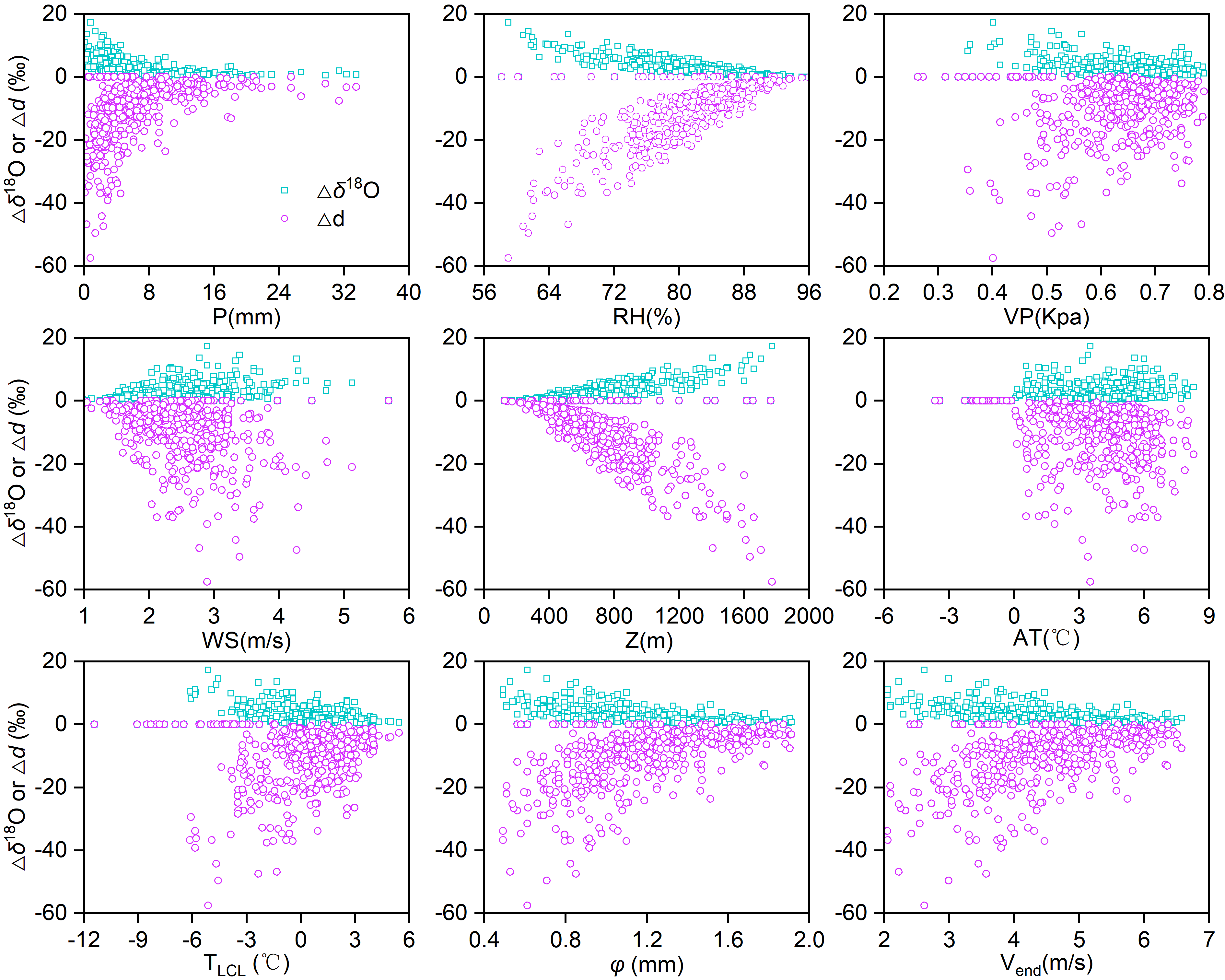 研究团队依托12年连续观测数据,采用瑞利蒸发模型模拟云下蒸发过程,结合多海拔站点对比分析与自主构建的同位素分馏模型,量化了云下蒸发对降水稳定同位素的影响程度,并揭示关键驱动因子及作用机制。
