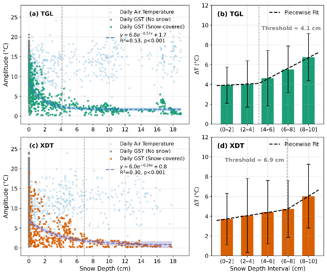 研究表明,在气候变暖与积雪减少背景下,若忽视浅雪的冷却效应,可能系统性低估其对冻土降温与能量通量调节强度。本研究将深度敏感、阈值感知的积雪过程纳入寒区陆面与气候模型,对提升冻土演变与极端事件风险评估的准确性具有重要意义。