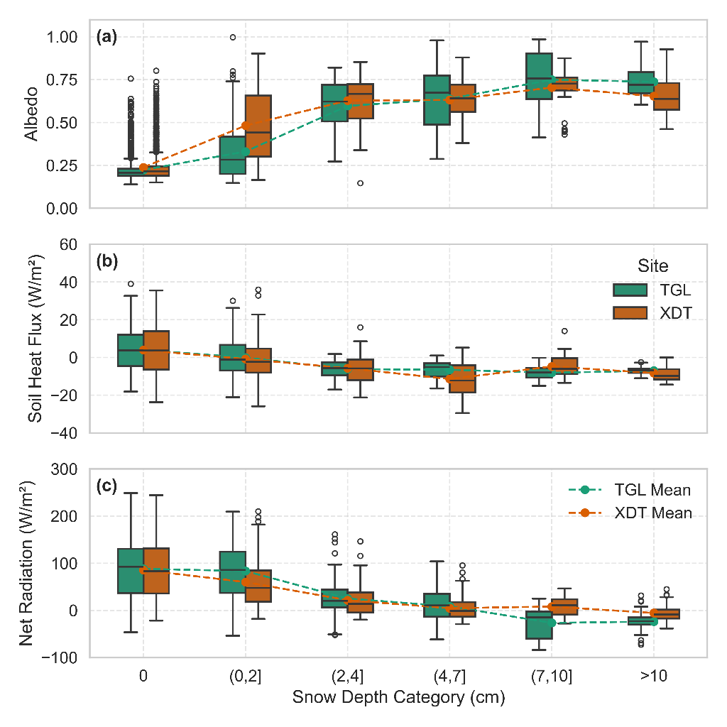 研究发现,当雪深超过4.1 cm(唐古拉)与6.9 cm(西大滩)时,地表温度振幅显著收敛、保温效应确立;而在<2 cm的浅雪条件下,强反照率与融雪潜热耗散导致地表冷却强化。同时,地表净辐射与土壤热通量随雪深呈非线性衰减并趋稳。