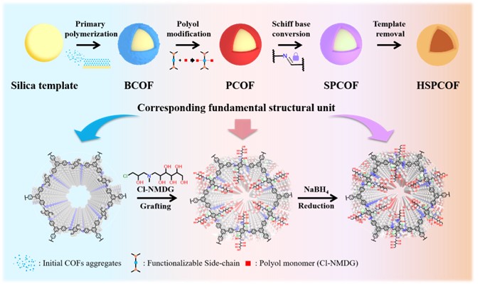 针对共价有机框架(COFs)类吸附剂在实际合成过程中COFs易出现的堆积无序与功能位点可及性受限等问题,提出了基于侧链工程的结构重构策略。通过单元锚定多元醇侧链实现功能化,同时依靠其对单元稳定性的提升实现了COFs晶体有序度的强化。在经稳定化修饰及模板去除后,成功获得了具有中空结构与较大比表面积以及多元醇功能化的COF吸附剂(HSPCOF)。该材料兼具高比表面积、连通孔道与优异的化学稳定性,可在298 K下实现150.05 mg g-1 的硼吸附容量,是商业树脂MK51的10倍以上。密度泛函理论(DFT)计算表明,多元醇侧链可与硼酸根形成双齿环状酯络合物,从而赋予材料高选择性与强结合能力。即使在实际盐湖卤水中,HSPCOF仍能表现出优异的稳定性与91.51%的硼去除率,证实了其在复杂体系中的应用潜力。该研究不仅阐明了COF在硅模板表面的生长与重构机理,还提出了一种通过侧链工程实现结构有序化与功能精确调控的普适策略,为中空功能化COF基硼吸附材料的可控制备及高效分离应用提供了新的思路。该工作发表于国际知名期刊Angew.(IF=16.9,一区TOP)上,江苏大学博士生王文庆(与青海盐湖所联合培养)为论文第一作者。