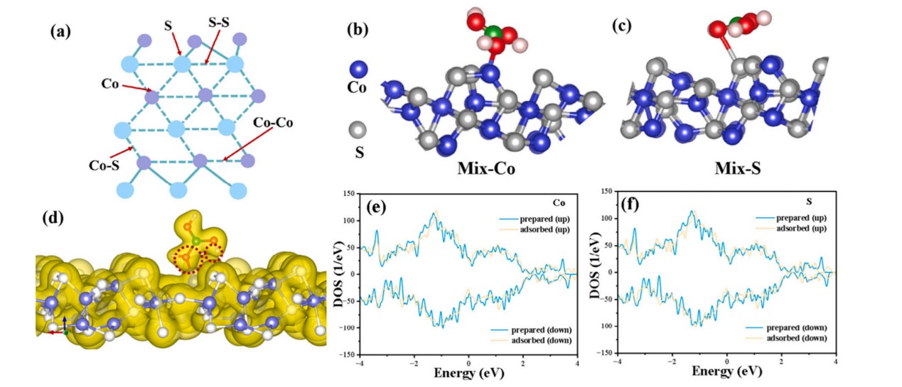 图2.(a)ZIF-67衍生Co3S4中空吸附剂的吸附位点示意图;(b-c)H3BO3在Co₃S₄上最稳定的结构(Co和S位点);(e,f)不同位点Co₃S₄吸附H3BO3的DOS图。