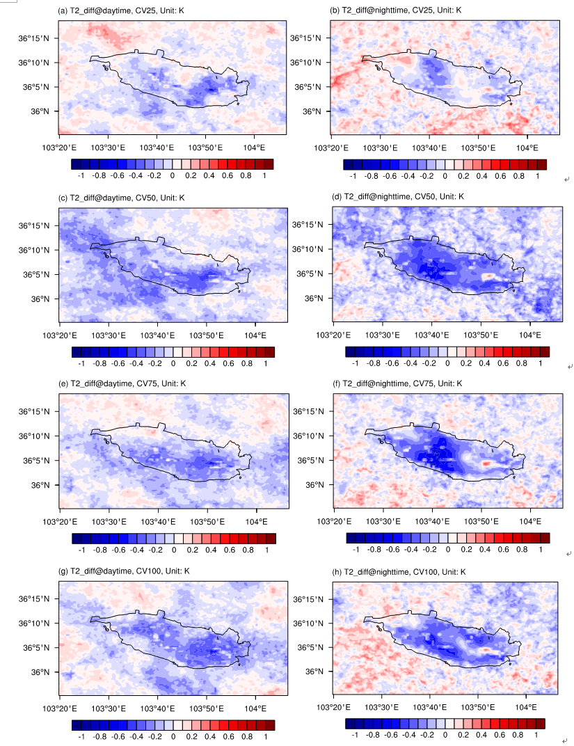 中国科学院西北生态环境资源研究院高晓清研究员团队聚焦我国典型复杂地形城市——兰州,在热浪事件背景下,利用国际先进的中尺度气象模型(WRF)并耦合城市建筑效应参数化与建筑能耗模型(BEP+BEM),精细模拟了不同覆盖率(25%、50%、75%、100%)下的屋顶光伏对城市热环境的多维度影响。