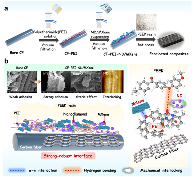 针对深海特异性损伤机理,课题组创新性地提出了一种强韧化界面增强策略。研究人员采用真空辅助压力渗透技术,在碳纤维织物表面成功构筑了一种“刚-柔”并济的杂化强韧界面结构(图2)。以聚醚酰亚胺为柔性相,发挥柔性粘接与应力缓冲作用;以纳米金刚石和二维MXene为刚性相提供物理阻隔与机械互锁点,协同抑制海水渗透扩散、促进应力高效传递(图4,5)。