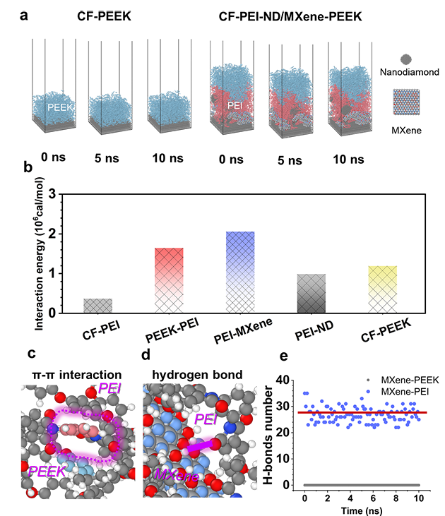 图4.CF-PEEK改性复合材料界面结构的分子模拟结果。(a)CF/PEEK复合材料和CF-PEI-ND/MXene/PEEK复合材料的模拟模型,(b)PEI与PEEK之间的π-π相互作用能和(c)PEI与PEEK之间的π-π相互作用,以及(d)PEI-MXene之间的氢键作用