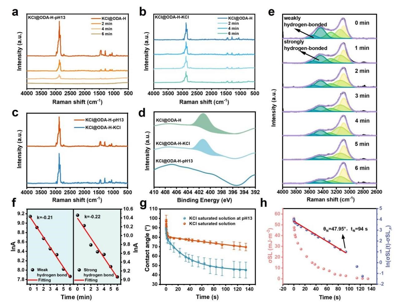 另一项工作则通过以碱度调控方式提高ODA-H的原位脱附效率,其KCl表面ODA-H的脱附率达到87%。MD模拟计算表明,OH⁻导致亲水基团(-NH3+)去质子化,破坏了ODA-H与KCl表面之间的静电相互作用,并在碱性条件下促使亲水基团脱离KCl表面。该机制可通过以下三个递进阶段系统阐明:(1)OH⁻诱导ODA-H脱附;(2)固–液界面张力降低;(3)扩散过程加速,从而促进OH⁻向吸附位点的高效传输。