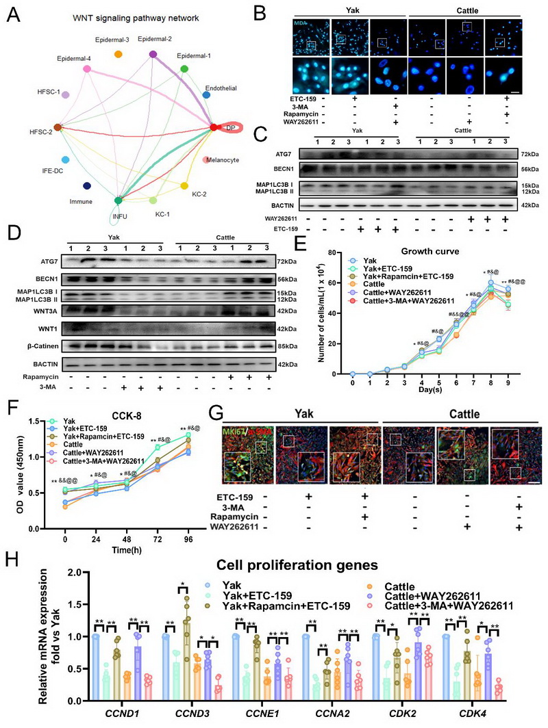 文章代表图:DP细胞中自噬与增殖的相互作用由WNT/β-Catenin通路介导。(A)DP细胞单细胞数据中WNT信号通路的细胞相互作用图。(B)不同处理后牦牛和普通牛DP细胞的MDA活细胞染色。(C)牦牛、牦牛+ETC-159、普通牛和普通牛+WAY262611处理组DP细胞中ATG7、BECN1和LC3I/II的蛋白质印迹分析(n=3)。(D) 牦牛、牦牛+3-MA、普通牛和普通牛+雷帕霉素处理组DP 细胞中ATG7、BECN1、LC3I/II、WNT3A、WNT1和β-Catenin的蛋白质印迹分析(n=3)。(E-F)牦牛、牦牛+ETC-159、牦牛+雷帕霉素+ETC-159、普通牛、普通牛+WAY262611和普通牛+3-MA+WAY262611组DP细胞的生长曲线(n=9)和CCK-8检测结果(n=4)。(G)不同处理组牦牛和普通牛DP细胞体外培养后PCNA和MKi67的代表性免疫荧光图像(n=8)。(H)实时荧光定量PCR检测细胞增殖相关基因CCND1、CCND3、CCNE1、CCNA2、CDK2和CDK4的mRNA表达情况(n=6)