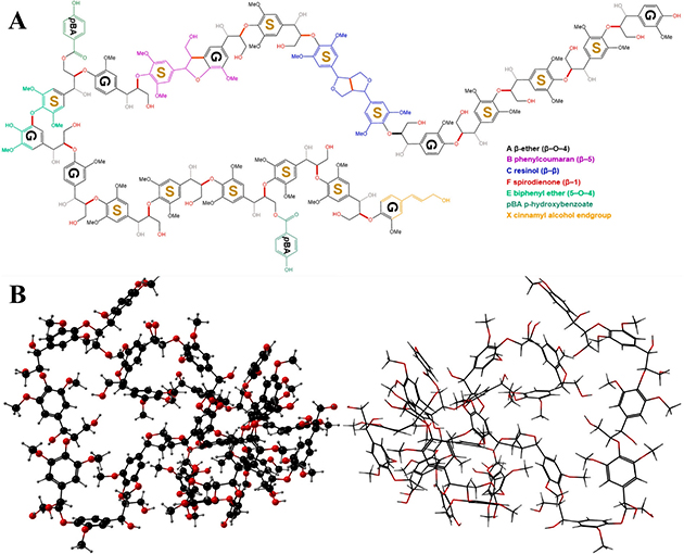 图 1. 果实木质素的二维(A)和三维(B)结构