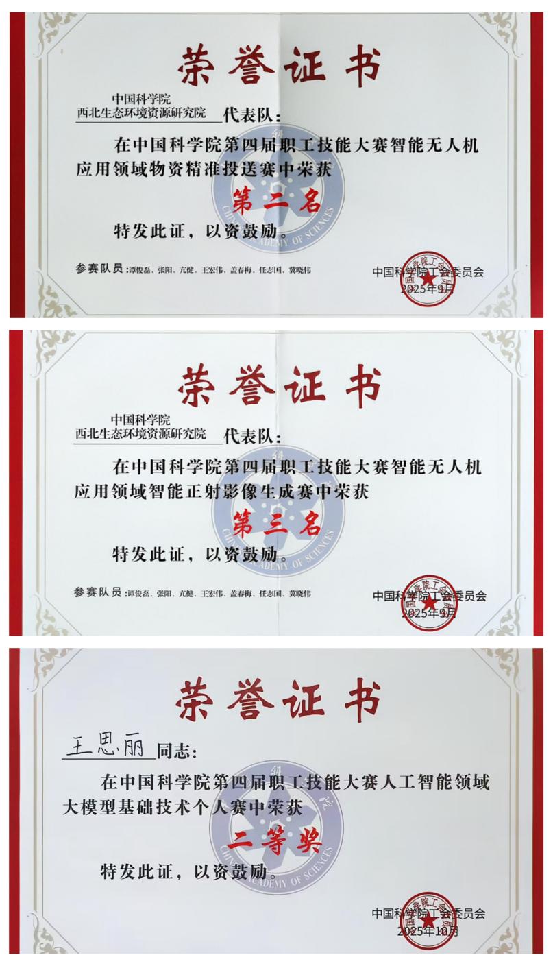 在西北研究院党委的高度重视与工会的精心组织下,科研团队积极响应、踊跃参赛。智能无人机应用领域,由黑河遥感试验研究站谭俊磊、亢健、张阳等6名选手组成的团队通过精准路径规划与动态负载调控,实现复杂环境下物资的稳定投送,依托自研靶标识别程序,显著提升正射影像数据处理效率,荣获了“物资精准投送”赛道全院第二名,“智能正射影像生成”赛道全院第三名和团队三等奖。在网信智能应用服务领域,国家冰川冻土沙漠科学数据中心团队将专业领域数据和服务能力与AI的强大分析推理能力结合,实现自然语言交互、数据智能分析和可视化展示,提升了数据中心的智能化服务水平,荣获了“MCP云服务”赛道三等奖。在人工智能领域,文献情报中心王思丽基于中国科学院 “磐石・科学基础大模型”,围绕人工智能基础理论、实操能力与知识融合推理能力展开角逐,荣获“大模型基础技术个人赛”二等奖。