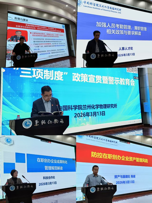 为进一步加强科研项目申报管理、人员兼职管理和岗位管理等“三项制度”的执行和有效监管,3月13日,中国科学院兰州化学物理研究所举办“三项制度”政策宣贯暨警示教育会。