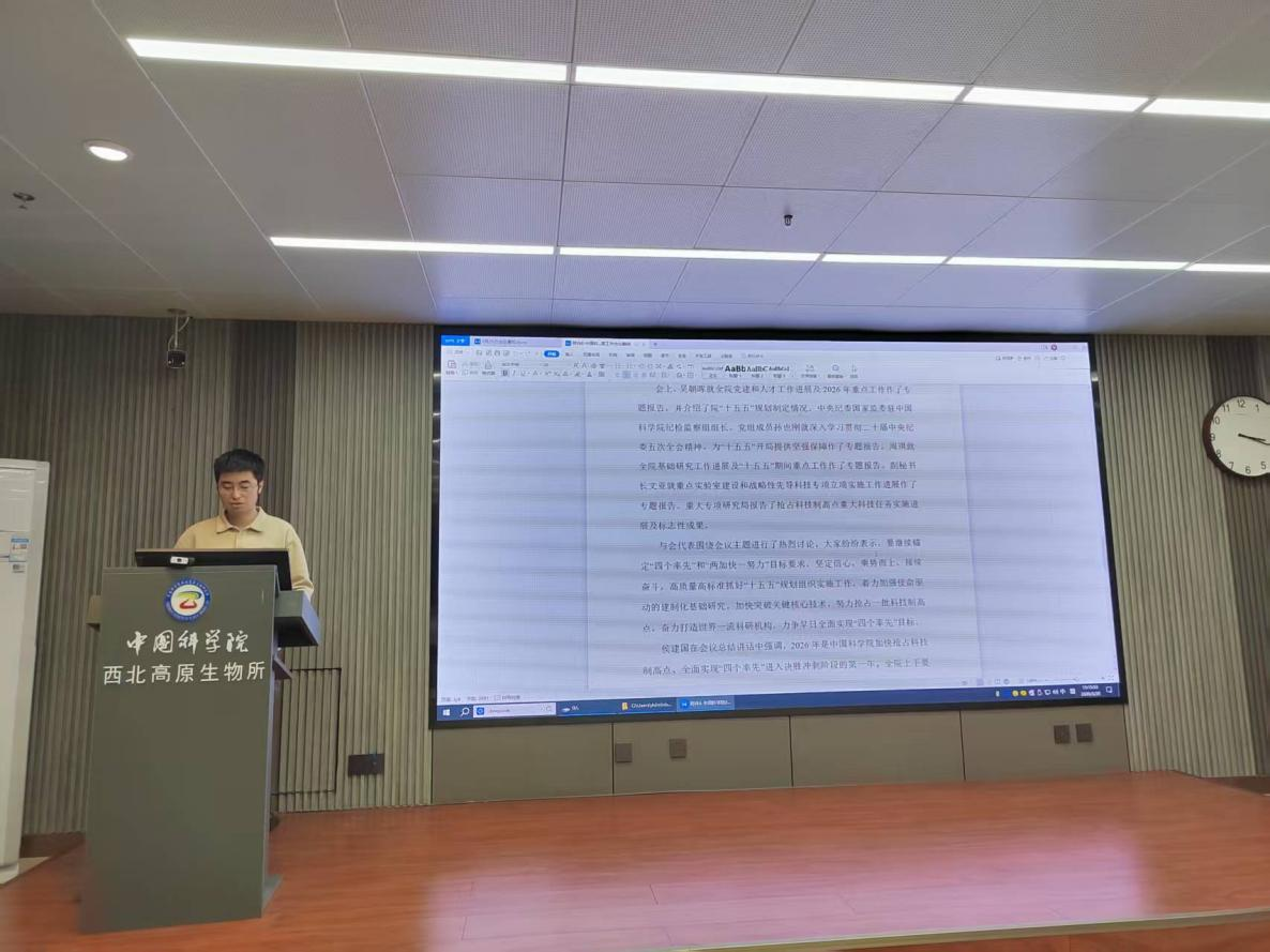 组织委员兼纪检委员张昆领学了习近平在中共中央政治局第二十四次集体学习会议精神,通报了《中共中国科学院西北高原生物研究所委员会2025年度党员领导干部民主生活会征求意见反馈》。