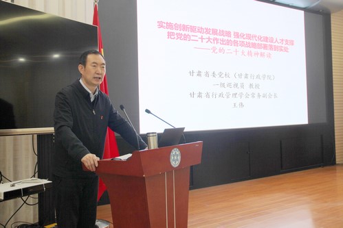 王伟教授以《实施创新驱动发展战略 强化现代化建设人才支撑 把党的二十大做出的各项战略部署落到实处》为题,从深刻领会党的二十大重大意义、全面学习把握落实党的二十大精神和认真学习贯彻党的二十大精神、坚定不移把党中央决策部署落到实处三个部分,结合学员特点,以教育、科技、人才和干部等方面相关论述为重点,用生动形象的语言,系统全面解读了党的二十大报告的核心要义和丰富内涵。