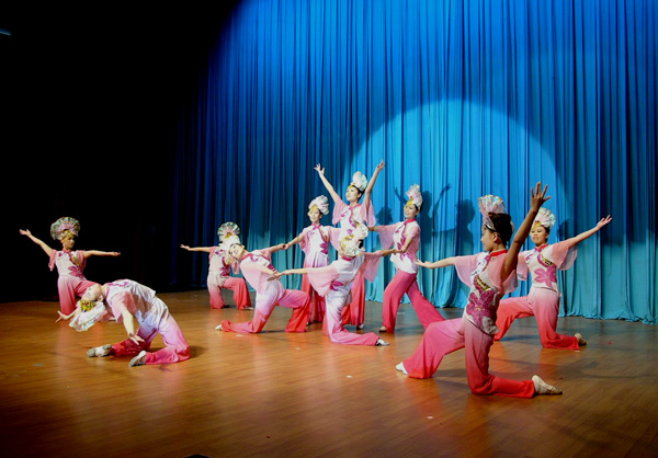 5月10日,位于玉泉路的研究生院园区张灯结彩,充满喜庆色彩。校园内到处是身着统一文化衫的年轻学子的笑靥,映衬着夏意绵绵的绿地,感觉温暖而又充满激情……演出开始前大礼堂里已经是座无虚席,走廊内都站满了来自自个院所的青春飞扬的学生,庆祝气氛热烈而浓郁。演出共有合唱、舞蹈、小品、相声等多种形式的十八个节目。在代表全院100多家单位选送的节目,我们兰州教育基地就有两个节目被荣幸地选中:寒旱所一支十个女孩组成的民族舞蹈《月亮女儿》和盐湖所的相声《西哥东妹》。演出前大家的紧张、压力在登上舞台的那一刻完全化解成柔美的力量,灯光、化妆、服饰、音乐让我们在母校的生日时绽放出最美的自豪与骄傲!