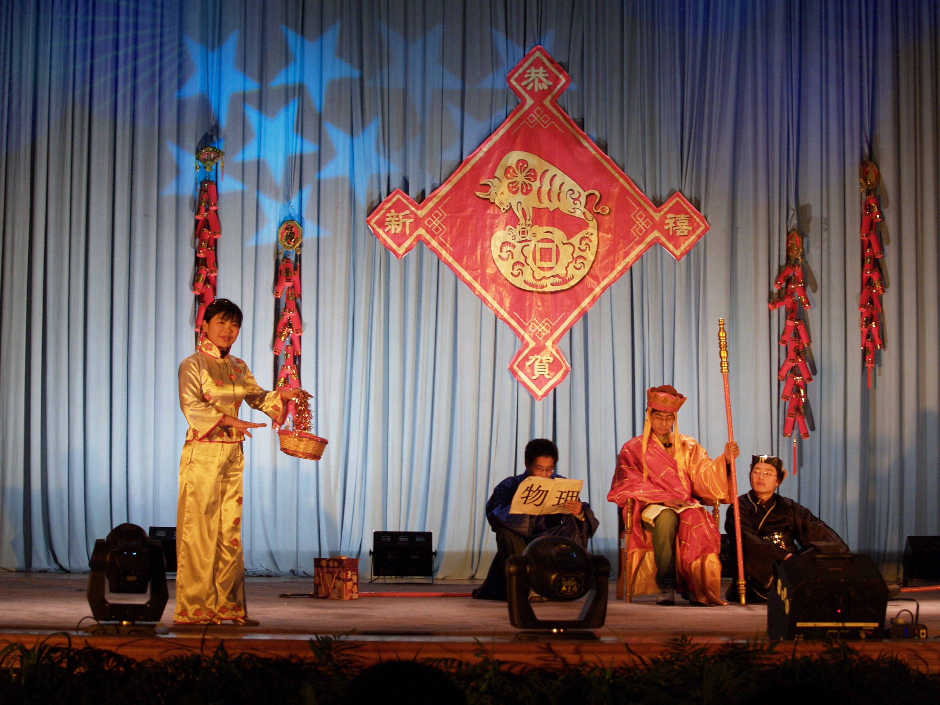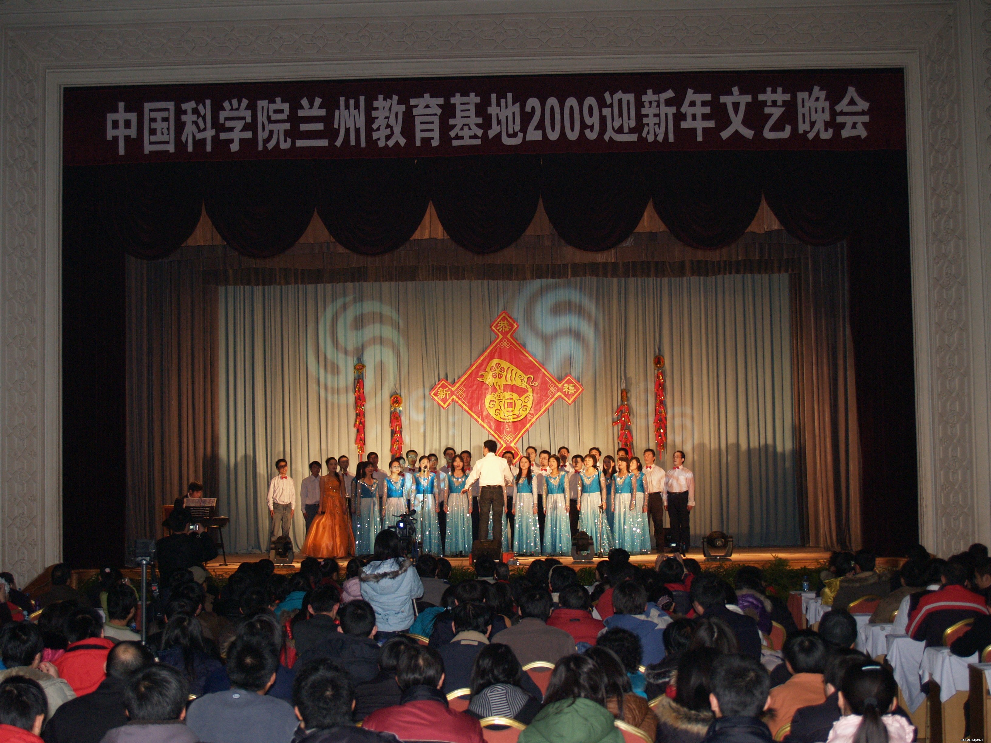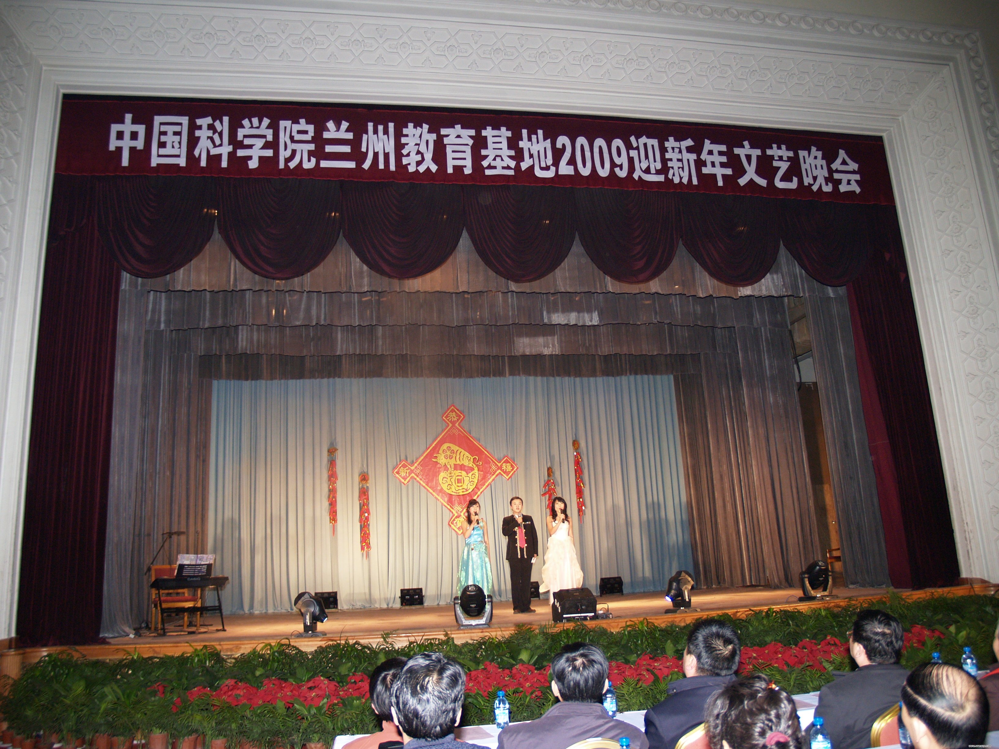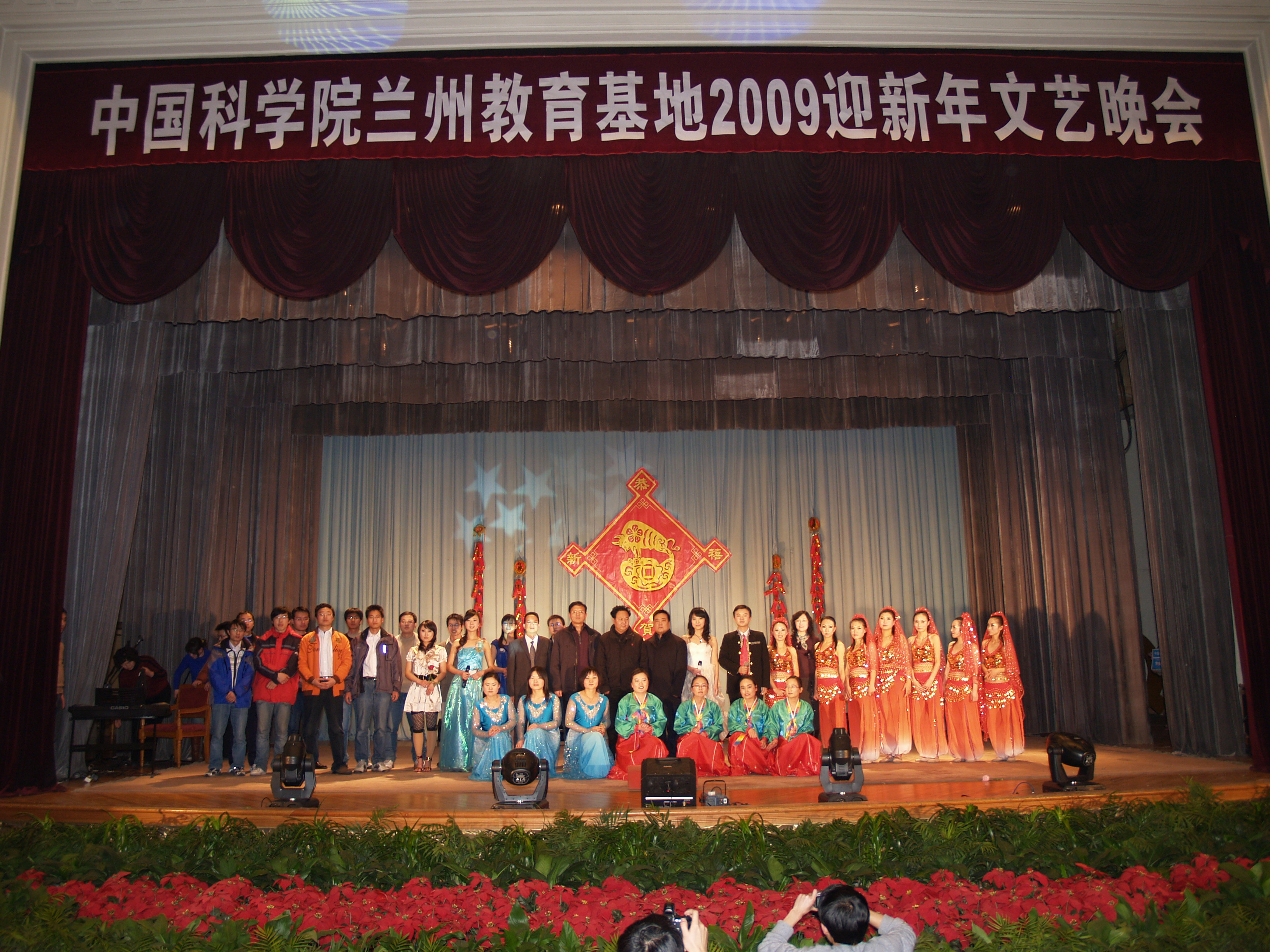为迎接2009年的到来,兰州教育基地于2008年12月30日晚举办了迎新年文艺晚会。来自兰州、西宁的领导和师生员工共四百余人参加了文艺晚会,兰州分院副院长杨生荣为晚会致辞,近代物理所谢铭书记、寒旱所吕世华书记、兰州化物所王齐华副所长、青海盐湖所贾优良副所长、西北高原生物所陈世龙副所长出席晚会观看表演。