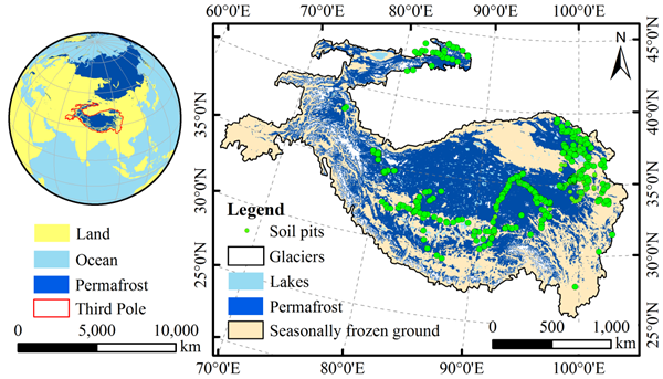 冻土中储存着大量有机碳,是陆地生态系统中最大且周转时间最长的碳库。在全球变暖背景下,冻土发生大范围退化,导致其封存的大量有机碳被微生物分解释放,进一步加剧气候变暖。以青藏高原为核心的第三极是全球气候变暖最强烈的地区之一,其冻土中储存的有机碳可能成为气候变暖环境下的潜在碳源,之前已有第三极冻土有机碳储量估算结果还存在一定的不确定性。