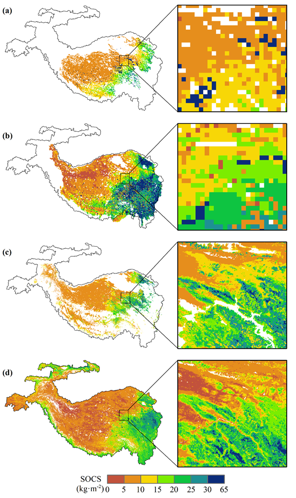 冰冻圈科学国家重点实验室吴通华研究员课题组通过整合2000以后公开发表的历史文献数据资料以及课题组相关实验监测数据(图1),采用机器学习方法模拟了第三极冻土区0-3m土壤有机碳储量和空间分布,得到了1公里高分辨率土壤有机碳分布图(图2),并与以往在第三极地区开展的冻土碳制图研究进行了对比分析(图3),重新估算了第三极地区冻土有机碳储量总量。模拟计算结果表明,第三极土壤有机碳自东南向西北递减,0~3m土壤有机碳总储量约为46.18 Pg,其中多年冻土区21.69 Pg,季节冻土区24.49 Pg。该数据集为地球系统模型提供了重要的基础数据,也可以为复杂地形条件下土壤属性的制图研究提供参考。