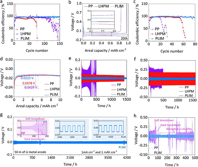 图2. 仿树叶隔膜对锂金属电池性能的影响