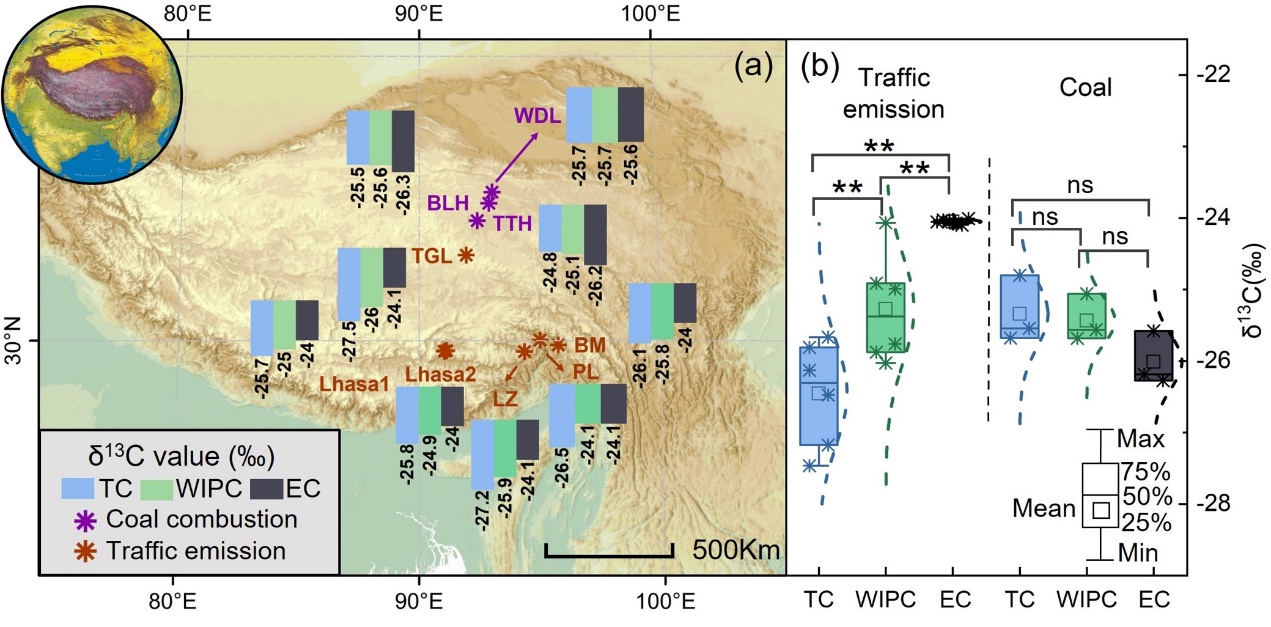 鉴于此,研究团队在青藏高原系统采集了化石燃料(交通和燃煤)排放、生物质燃料(牛粪和木材)燃烧排放的大气颗粒物样品以及表土样品。通过分析样品中总碳(TC)、水不溶性颗粒碳(WIPC)和元素碳(EC)的δ13C特征发现,青藏高原碳质气溶胶端元的δ13C值与其他地区存在显著差异。由于海拔较高,空气稀薄,化石燃料燃烧排放颗粒物的δ13C值相对其他地区偏负。由于燃料的特殊性,生物质燃料燃烧排放颗粒物的δ13C值则相对其他地区偏正。且由于燃烧状态的不同,牛粪燃烧以及交通排放颗粒物中不同碳质组分(TC、WIPC、EC)的δ13C值存在显著差异,而煤炭与木材燃烧排放颗粒物中不同碳质组分的δ13C值无显著差异。细颗粒表土(小于20μm)的δ13C值与区域植被类型的变化相关。