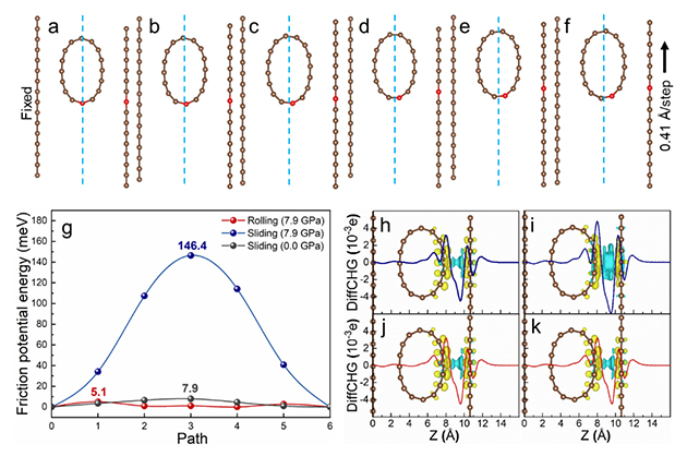 研究团队发现石墨纳米片在100K以下静态低温条件下会发生边缘自卷翘的奇特现象;利用这一效应,在摩擦过程中剪切力可进一步驱动其在摩擦界面上原位形成纳米卷轴结构,扫描电镜图像显示这些纳米卷轴呈现平行排列,且与滑动方向垂直,证明其发生了分子滚动润滑。同时石墨表现出反常的宏观真空润滑特性,在50K真空条件下,润滑状态变得平稳而长效,摩擦系数约0.06,磨损率仅为300 K时的1/50。通过密度泛函理论模拟计算,进一步揭示了分子滚动过程界面电荷能量耗散减弱的机制。该研究为解决传统石墨类材料真空润滑性能差和超低温润滑领域难题提供了全新解决思路和方案。