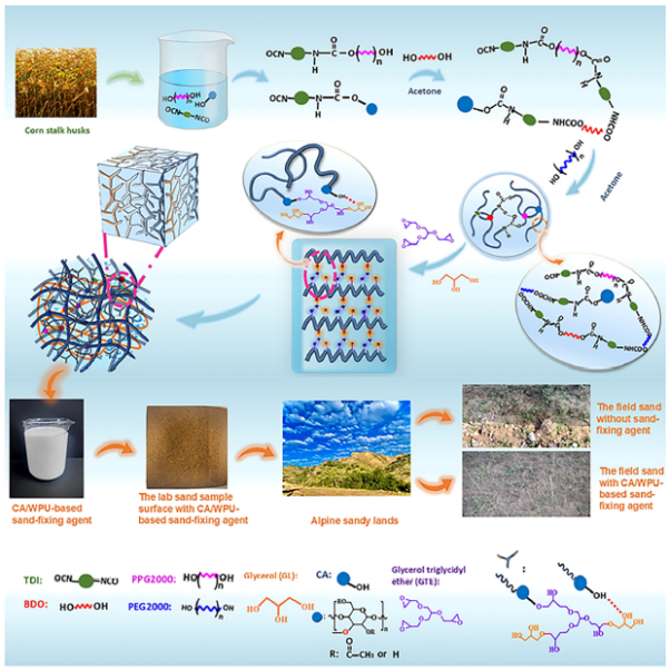 中国科学院西北生态环境资源研究院敦煌戈壁荒漠研究站科研团队以甘油三酯醚和甘油为主要原料,对以农作物秸秆为主要原料的醋酸纤维素基水性聚氨酯固沙剂进行改性以提高其防冻能力,研发了醋酸纤维素/水性聚氨酯/甘油三酯醚/甘油系列防冻固沙剂。该新材料具有良好的降解性能,热降解后的主要挥发性物质为水蒸气、氨气和二氧化碳,固沙层在−20℃低温条件下14天后固结强度保持稳定,在青海省共和县的实地应用证明其可以有效促进植物生长,可应用于广大寒冷荒漠地区的防沙治沙工作,推动环境友好型固沙材料产业的发展。