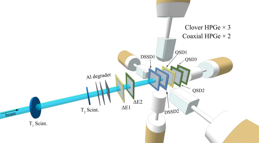 该探测阵列包含双面硅微条探测器、四分硅探测器与高纯锗探测器,同时结合了250 MHz采样率、14 bit精度的数字化读出系统。该系统采用波形数字化和高性能FPGA实时处理技术,能够同时测量衰变粒子的能量、时间、位置等信息。