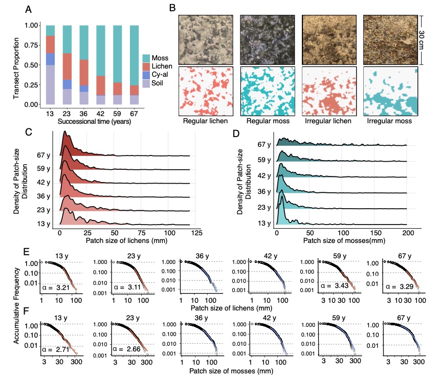 研究团队采用了计算建模与全局-局部耦合的野外调查相结合的研究方法。理论建模基于概率的元胞自动机(Cellular automaton)模型的开发,模拟了地衣和藓类斑块的动态变化。野外观测在中国科学院沙坡头沙漠试验研究站进行,通过在不同演替阶段的人工固沙植被带中设置样线,记录了生物结皮的覆盖度、组成和斑块大小分布。研究通过对幂律分布的拟合,从全局尺度检测主导生物结皮动态的反馈模式。通过不同演替阶段和不同斑块大小下生物结皮斑块中心与边缘之间的生长差异比较,从斑块尺度验证局部自组织过程,对比模拟结果揭示了生物结皮自组织机理及其生态意义。
