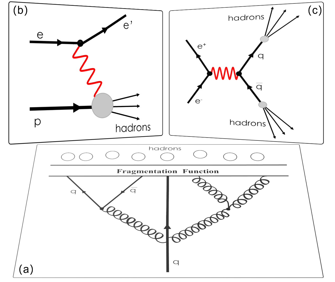图:(a)部分子碎裂至强子过程示意图,(b)电子-质子半单举深度非弹性散射过程示意图 (c)正负电子湮灭过程示意图。