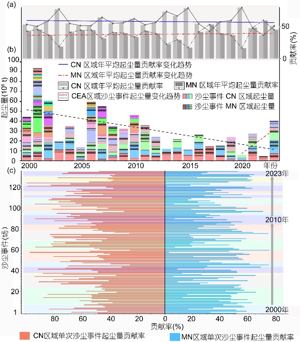 2000-2023年东亚中部地区中国北方与蒙古国大规模沙尘事件起尘量及贡献率变化