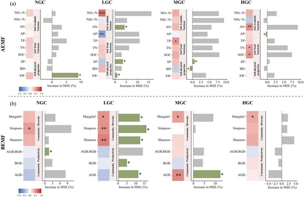 图1 不同砾石化水平下AEMF与BEMF的相关性及主要驱动因子重要性分析