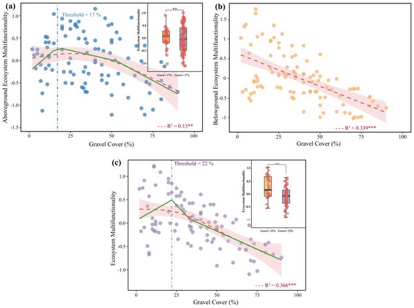 研究发现,随着砾石覆盖度的增加,草地植物物种丰富度、功能群组成及生物量显著下降,尤其是地下生物量的减少最为明显;土壤含水量、孔隙度及养分含量显著降低,而容重显著升高,导致生态系统整体功能衰退。砾石化不仅直接抑制植物生长,还通过削弱土壤养分供给间接降低生态系统多功能性。随机森林与结构方程模型分析进一步揭示,土壤养分和植物多样性是决定生态系统多功能性的关键调控因子。随砾石化程度加剧,地上功能指数(AEMF)和地下功能指数(BEMF)均显著下降,后者的响应更为敏感,当砾石覆盖度超过22%时,生态系统多功能性(EMF)出现明显突变性下降,表明该阈值可作为高寒草地退化的早期预警指标。研究指出,高寒草地砾石化退化过程会破坏植物-土壤耦合关系,导致生态功能的同步退化。