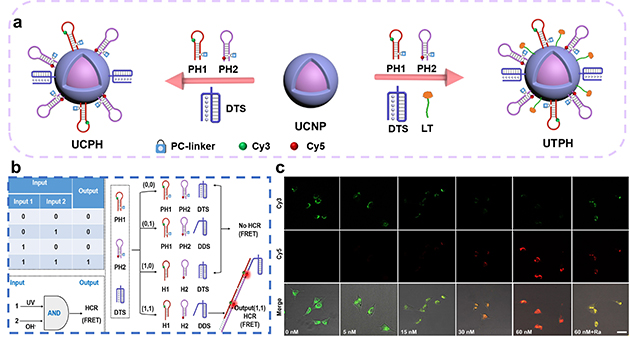 近日,中国科学院兰州化学物理研究所天然药物与化学测量研究中心海军研究员团队创新性地开发了一种近红外光(NIR)/pH双重激活DNA纳米探针(UTPH),首次实现了对AD病理过程中(如Aβ聚集时)溶酶体pH动态变化的实时、原位成像分析技术,发现了溶酶体pH动态变化与AD疾病进展高度相关。该技术具有高度模块化和可编程性,通过调整DNA序列中的CGC比例,可精细调控探针对溶酶体pH的敏感性范围;通过替换靶向配体,该技术可扩展应用于其它细胞器(如线粒体、细胞核)的溶酶体pH动态精准监测。研究结果为AD等多种神经退行性疾病的病理机制、早期诊断和药物筛选提供了通用的分子工具,也为在亚细胞水平探索生命过程和疾病机制开辟了新途径。