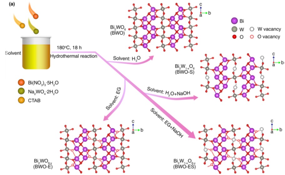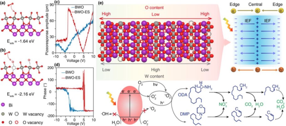 中国科学院青海盐湖研究所轻合金与稀散元素分离课题组根据钾盐浮选药剂性质特点,聚焦绿色高效处理的研究需要,结合高原地区自然光辐照强度大等优势,优化光催化材料缺陷工程改性策略,成功制备金属/非金属双缺陷铋酸盐光催化材料,考察其对可见光的吸收利用,并对双缺陷结构改性铋酸盐光催化剂的催化作用机制开展深入剖析。研究发现,在水热制备Bi2WO6过程中加入适当比例的还原剂(EG)和刻蚀剂(NaOH),可以实现“一锅法”在Bi2WO6纳米片的中心和边缘区域分别构筑O缺陷和W缺陷,强化提升铋酸盐的催化性能。机理研究发现:在双缺陷结构材料(BWO-ES)中,W缺陷作为负电荷中心,O缺陷充当局部的正电荷中心。当这些带相反电荷的缺陷在晶格不同位置建立时,使Bi2WO6材料的静电偶极距由本体材料(BWO)的1.54 D提升至BWO-ES的48.15 D,促使材料的内建电场强度提升2.74倍,为光生电子-空穴对的有效分离提供了内部驱动力,从而抑制光生载流子的复合,表现的瞬态荧光寿命由BWO的1.61 ns提升至BWO-ES的2.63 ns。此外,O缺陷的构筑降低了材料的带隙(2.78 ev→2.54 eV),拓展了材料的光响应范围(446 nm→488 nm)。在可见光(λ≥400 nm)照射下,BWO-ES对十八胺(ODA)和十二烷基吗啉(DMP)的降解速率分别达到13.31 mg/L·h和14.40 mg/L·h,是本体BWO材料降解速率的3.64倍和3.59倍,可实现盐溶液中ODA、DMP的完全矿化。