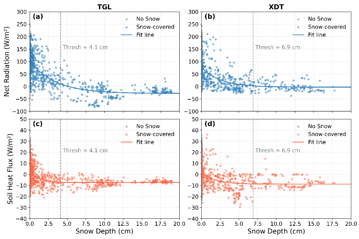 研究发现,当雪深超过4.1 cm(唐古拉)与6.9 cm(西大滩)时,地表温度振幅显著收敛、保温效应确立;而在<2 cm的浅雪条件下,强反照率与融雪潜热耗散导致地表冷却强化。同时,地表净辐射与土壤热通量随雪深呈非线性衰减并趋稳。
