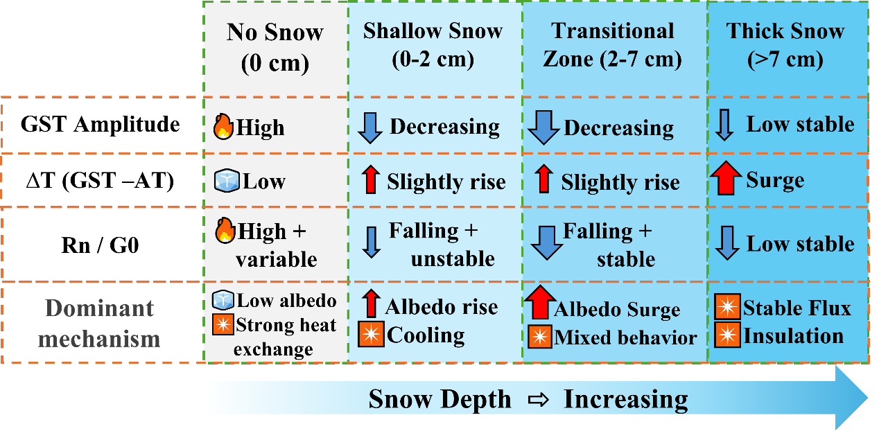 据此研究提出了“四区间机制框架”,即裸地—薄雪(0–2 cm)—过渡雪(2–7 cm)—厚雪(>7 cm)。该框架刻画了从强地–气耦合的冷却阶段,跨越阈值进入稳定保温阶段的演变路径,为浅雪主导区的雪–地相互作用提供了可操作的判据与参数化思路。