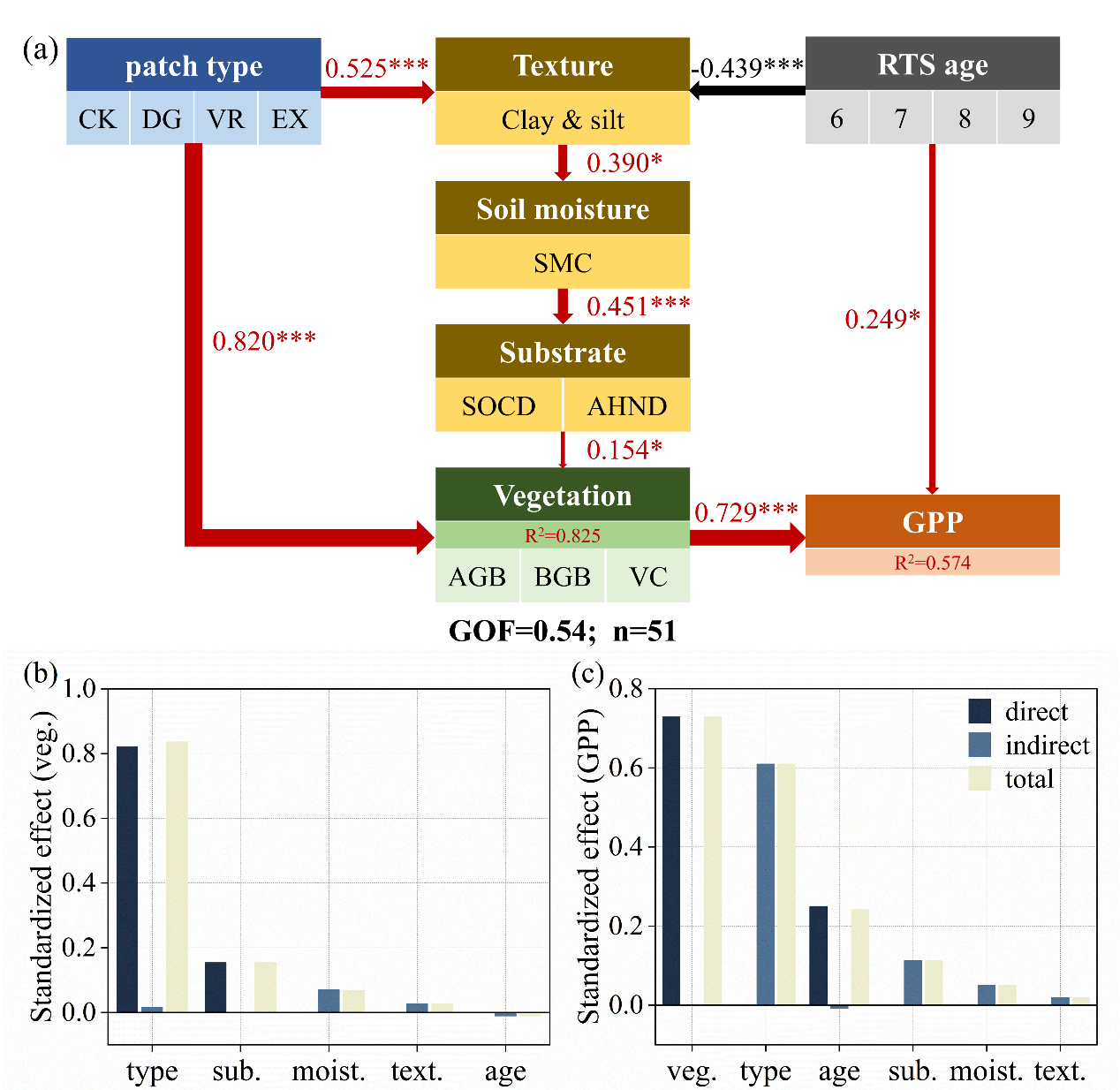 偏最小二乘路径模型结果表明,热融滑塌主要通过“土壤质地-水分-基质-植被-GPP”路径影响青藏高原生态系统功能。其中植被对GPP的直接控制最强,滑塌年龄次之,土壤过程则更多通过调节群落结构间接作用影响GPP。因此,在评估热喀斯特地貌的碳效应时,应将滑塌地表类型及年龄组成纳入考量。