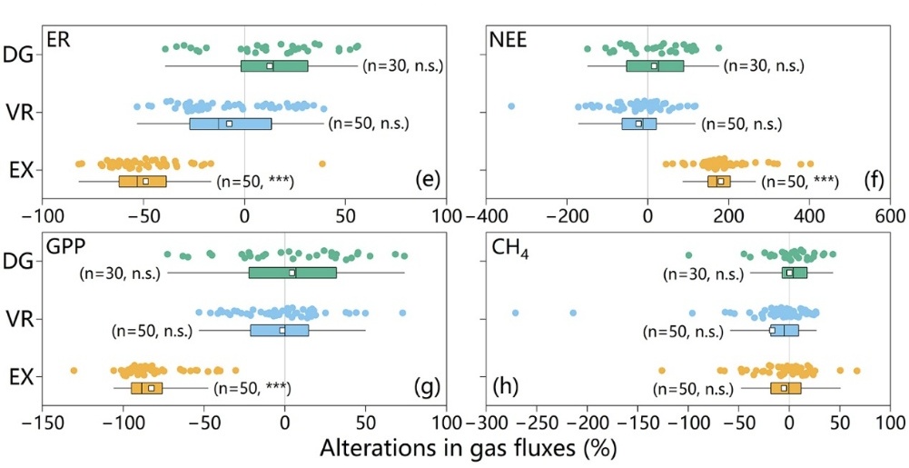 研究表明,热融滑塌显著削弱了高寒草地的碳汇功能。与未扰动区域相比,在植被被剥蚀的裸露地表,生态系统呼吸降低了49%,而总初级生产力则下降82%,导致净生态系统交换增加181%,由碳汇完全转变为碳源。虽然裸露地表表现出持续的CH4吸收,但其吸收量级远不足以抵消额外排放的CO2。