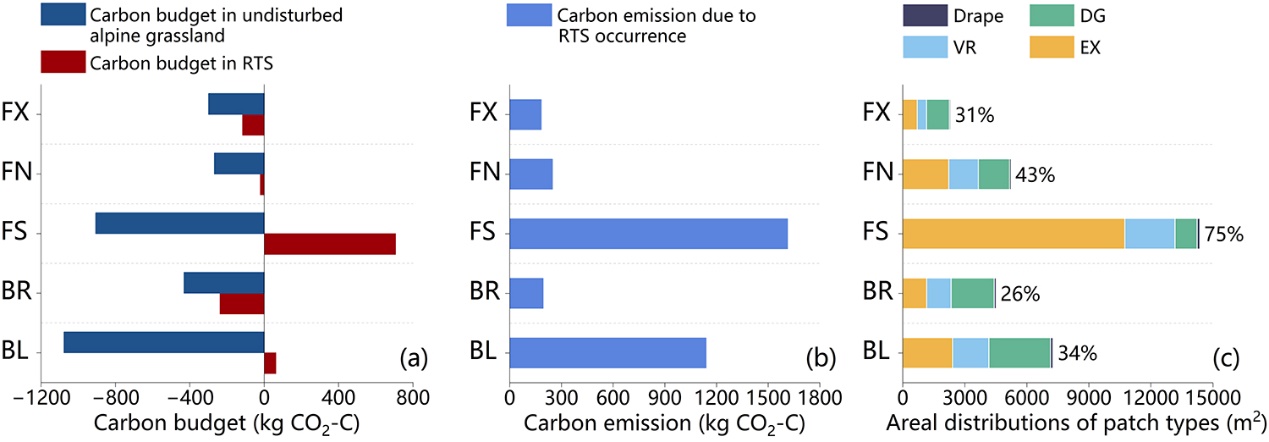 青藏高原是全球最大的高海拔多年冻土区,储存着大量土壤有机碳。近年来,随着气候变暖、多年冻土广泛退化,热融滑塌、热融沟和热融湖塘等反映多年冻土快速融化现象的热喀斯特地貌广泛发育,其对高寒生态系统碳循环和气候反馈的影响备受关注。然而,与热融沟和热融湖塘相比,无论是青藏高原还是环北极多年冻土区,热融滑塌(retrogressive thaw slumps,RTS)对冻土生态系统碳动态的影响都缺乏系统性研究。