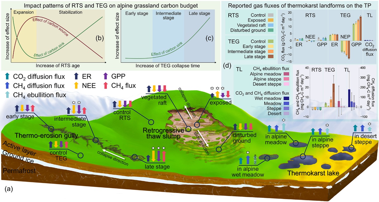 中国科学院西北生态环境资源研究院冰冻圈科学与冻土工程全国重点实验室研究团队联合兰州大学、丹麦哥本哈根大学以及中国科学院植物研究所,于2024和2025年在青藏高原腹地开展系统性温室气体通量观测,量化了热融滑塌所导致的通量变化以及研究区域的碳收支平衡,为评估气候变化背景下青藏高原多年冻土碳反馈提供了关键证据。