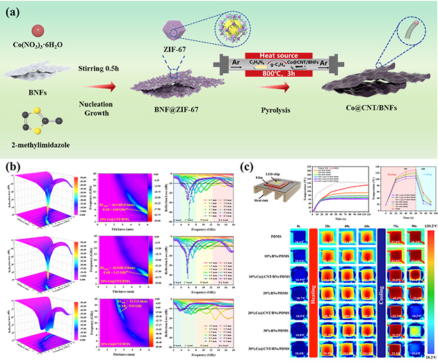 图1.(a) Co@CNT/BNF复合材料制备示意图;(b) 吸波性能和(c) 导热性能。