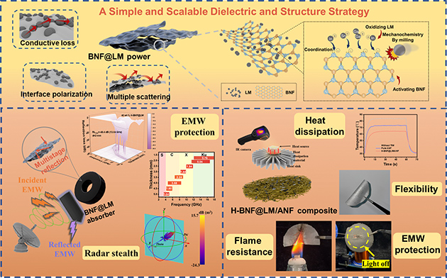 近期,针对传统h-BN改性方法工艺复杂和环境负荷大的问题,研究团队提出了一种简易且可扩展的机械力诱导活化改性策略,调控h-BN的导热和吸波性能。该研究利用液态金属(LM)的流动性及其高导电特性,通过机械过程让LM与BNFs充分接触并发生反应,从而活化BNFs表面,引入丰富的界面极化中心和缺陷位点(BNF@LM)。优化后的BNF@LM复合材料在维持高效吸波性能的同时,能够与芳纶纳米纤维复合制成柔性复合薄膜,展现出优异的热管理及良好的阻燃性能,确保了材料在极端环境下运行的可靠性。相关研究结果发表在Journal of Advanced Ceramics (2025,14,9221208) 上。