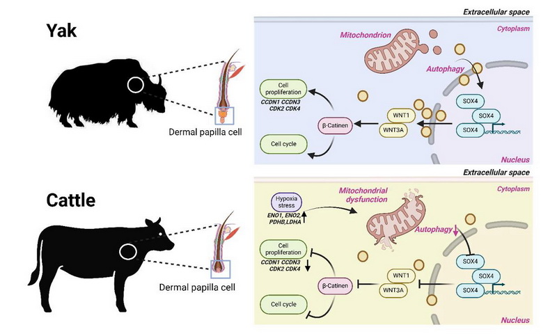研究团队进一步利用ATAC-seq与ChIP-qPCR发现了转录因子SOX4可直接结合WNT1与WNT3A基因的启动子区域,且这一结合对基因的转录激活作用通过双荧光素酶实验得到验证。SOX4的表达受自噬水平调控,激活自噬可挽救SOX4抑制剂对DP细胞增殖的抑制作用。该调控通路在牦牛体中表现出更强的信号活性,通过促进DP细胞周期进程、增强细胞增殖能力来维持毛囊稳态;同时,该通路还能改善线粒体结构完整性以抵御氧化应激,从而可能促进毛囊生长,系统性增强牦牛对高原寒冷环境的生存适应能力。总之,研究团队从单细胞水平解析了牦牛毛囊适应高原寒冷环境的分子特征,为理解动物对高原极端环境的适应机制提供了重要基础数据。