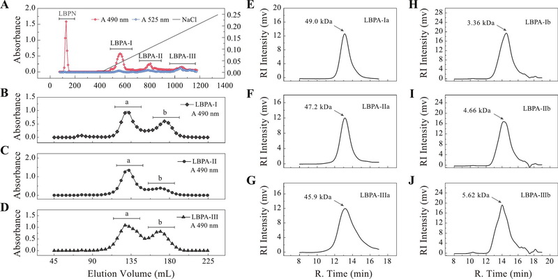 图1 枸杞果胶组分及其6个亚组分的分离纯化与均一性检测色谱图