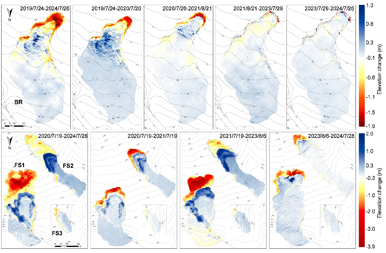 该研究的相关成果以Centimeter-resolution 4D dynamics of retrogressive thaw slumps from repeat UAV photogrammetry on the Tibetan Plateau为题,发表于国际期刊Remote Sensing of Environment。西北研究院高思如副研究员为论文第一作者,蒋观利研究员为通讯作者。该研究得到国家重点研发计划项目、国家自然科学基金面上项目、甘肃省自然科学基金项目和中国科学院“西部之光”青年学者项目资助。