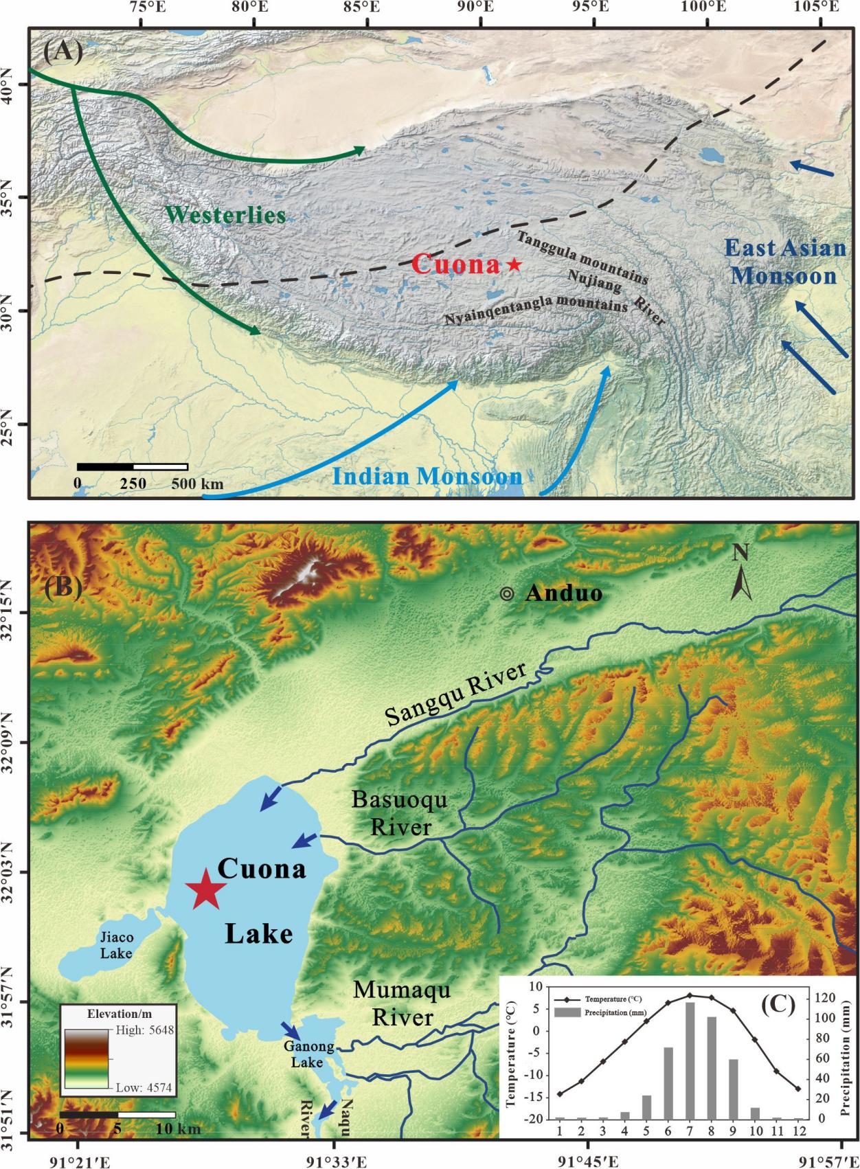 青藏高原中部错那湖地理背景及CN12/01钻孔位置