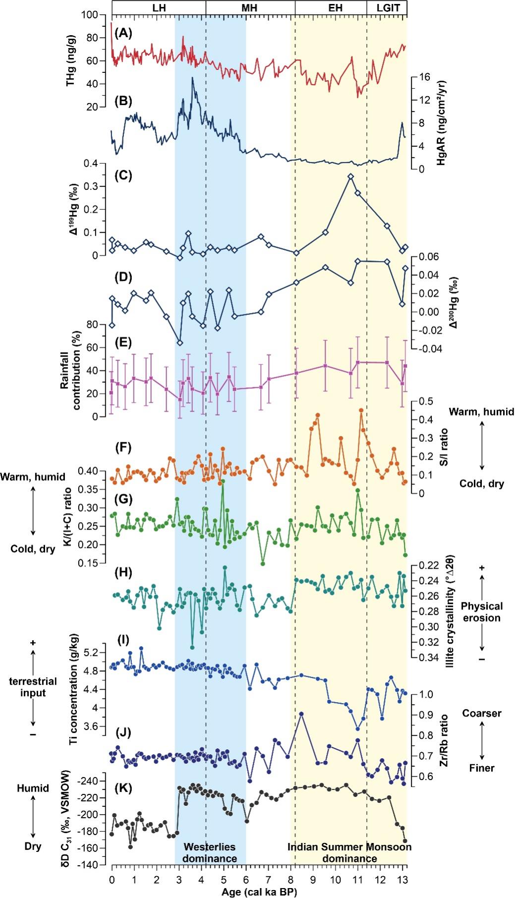 错那湖CN12/01岩芯末次冰消期以来(~13 ka BP)的沉积记录,包括总汞浓度、汞堆积速率、汞同位素组成与降水贡献结果、粘土矿物和元素地球化学指标,以及错那湖湿度记录