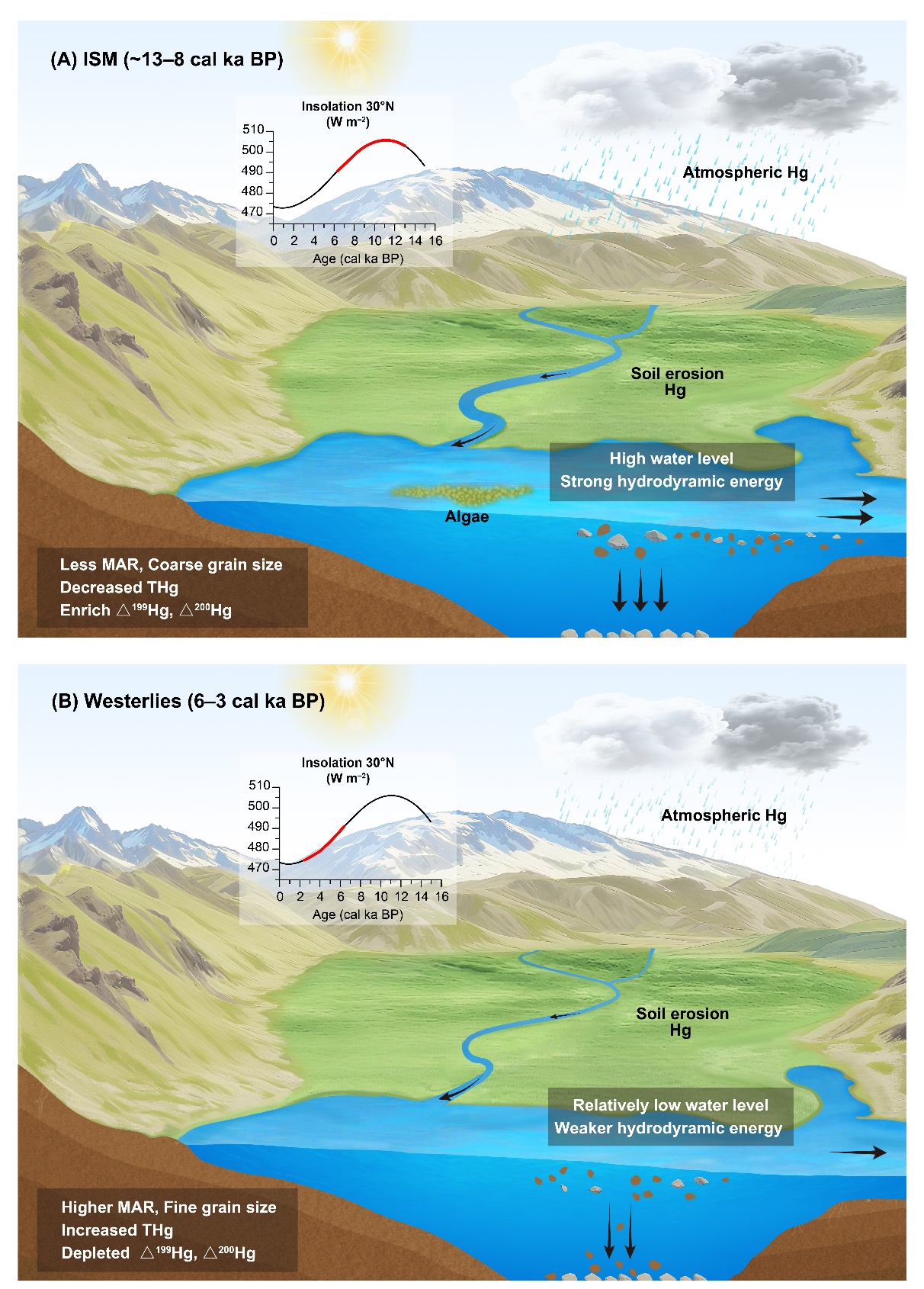 研究表明,约在6 ka BP前后,错那湖在区域汞循环的功能从“搬运者”转变为“汇”,这一转变与季风-西风主导气候格局的变化密切相关。气候变化通过调控湖泊水位、水动力强度等水文环境因素,影响汞在湖泊中的迁移和沉积过程。在印度夏季风主导时期,区域气候暖湿、降水丰沛,湖泊水位高,水动力强劲,即使大气和流域的汞输入有所增加,大量携带汞的细颗粒沉积物仍会在强水动力作用下继续悬浮并输送到下游,导致湖心区汞的积累较少。在西风主导时期,气候转为相对干冷,降水减少,湖泊水位下降、水动力减弱,细颗粒物更易在湖中心沉积并被保存,加之河口至湖心的输送距离缩短,使得区域内汞的堆积显著增加,达到季风时期的2–4倍。