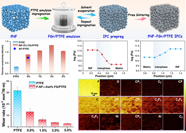 针对泡沫金属与聚四氟乙烯异质界面结合弱的问题,研究人员采用氟硅烷偶联剂对泡沫镍三维连续界面进行液相氟化改性,同时在基体中引入少量氟化石墨。结果表明,界面-基体“双氟化”的设计有效增强了泡沫镍与聚四氟乙烯之间的界面结合,从而抑制外力拉伸时的变形与裂纹扩展;少量氟化石墨的引入增强了PTFE连续相的硬度、模量,使得双连续相复合材料的导热系数提升至1.3 W/(m·K)。得益于由聚四氟乙烯、镍磨屑与氟化石墨在金属配副表面形成的复合摩擦转移膜,进一步改善了复合物的摩擦学性能,磨损率下降90.7%。相关研究结果发表在Composites Part B: Engineering(2025: 112816)上。