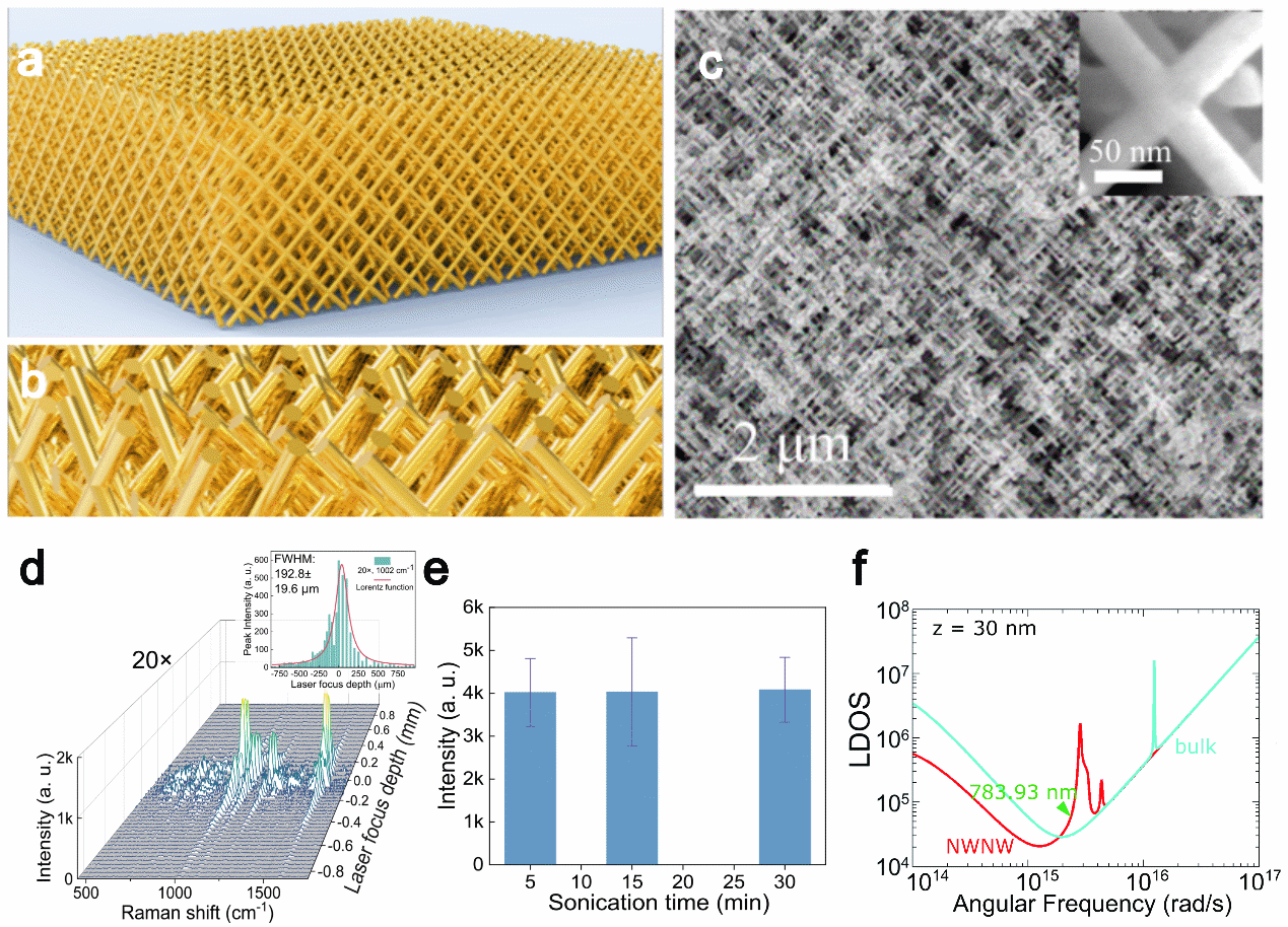 图:具有聚焦容忍性和结构稳定性的三维金纳米网格SERS衬底:a-b基于离子径迹技术制备的三维金纳米线网格模型;c金纳米线网格实物的扫描电镜照片,纳米线直径为35 nm;d 三维衬底在20倍物镜下能够在离焦范围192.8±19.6 μm内保持50%的SERS信号;e 超声水应力环境SERS稳定性测试,在30分钟超声后仍能保持信号稳定;f 有效介质模型反映出纳米线网格结构在激发光附近的高局域态密度。
